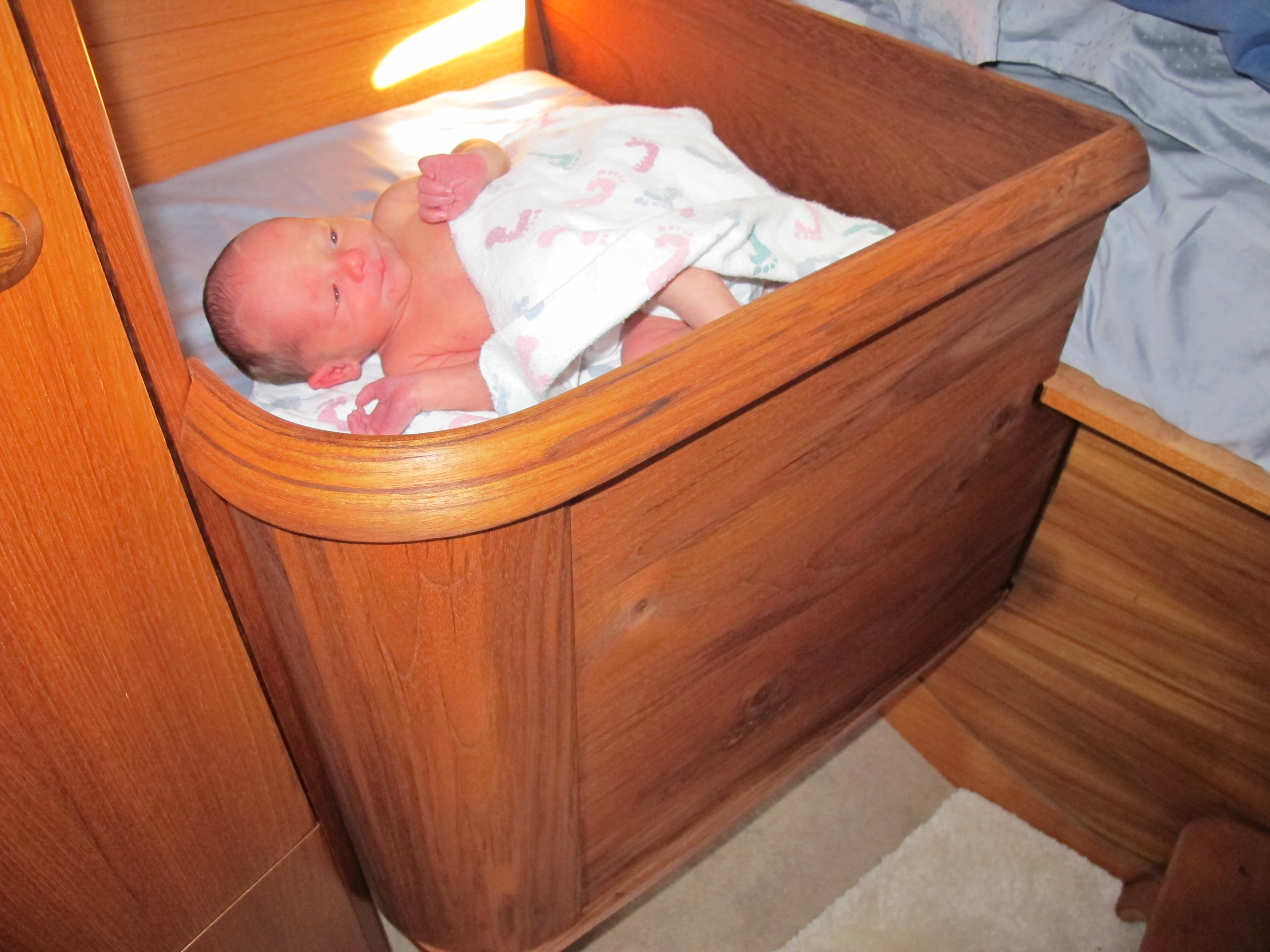 Daddy’s been customizing the boat for me, with a teak bassinette and baby bathtub. So for now, I get to sleep with mom and dad in the forecabin. When I get a bit older, I’ll have the whole aftcabin to myself.