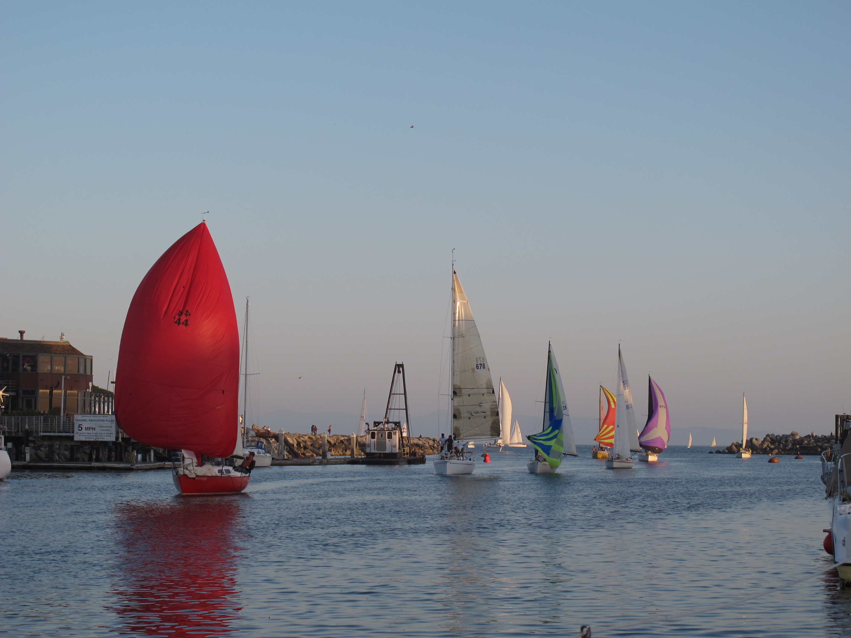 The Wednesday night sailboat races bring tons of noisy excitement and color into my life. Look at the boats entering the harbor with their jibs full of wind!