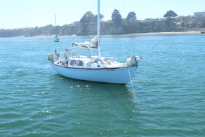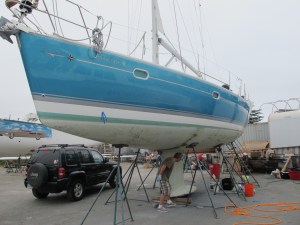 Sorry it’s been so long since I’ve made a post. We’ve been so busy this past week! Daddy and uncle Bob hauled out the boat to repair the damage from the Tsunami. They worked on it for 4 days in Moss Landing, which was a bit of a holiday for mommy and me. It was fun living in the boatyard… I liked taking walks to the Haute Enchilada and the farmer’s market, and listening to the sounds of the fishing boats and fog horns. Look at the fine paint job they did: