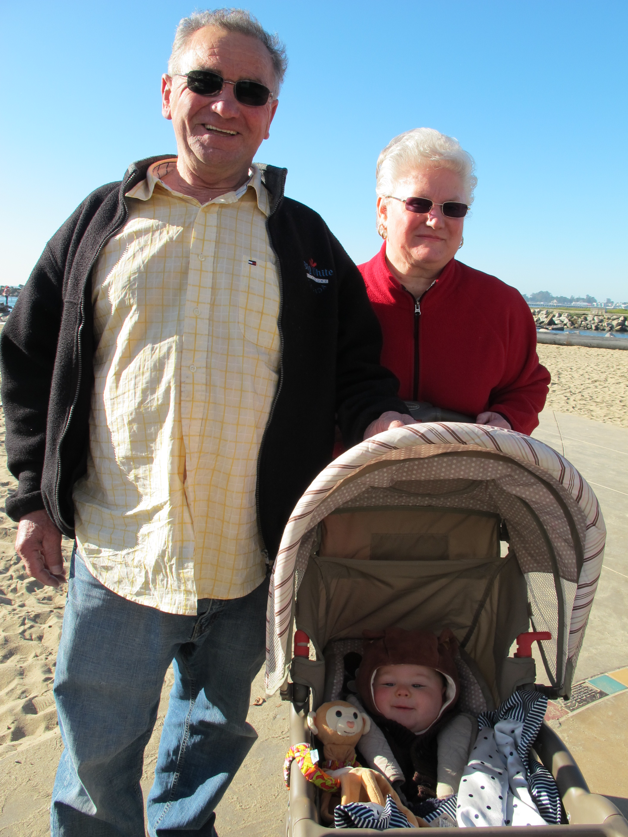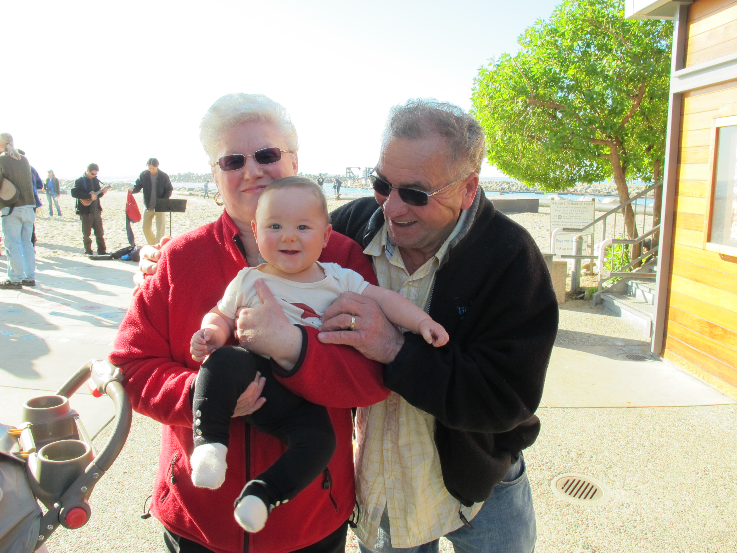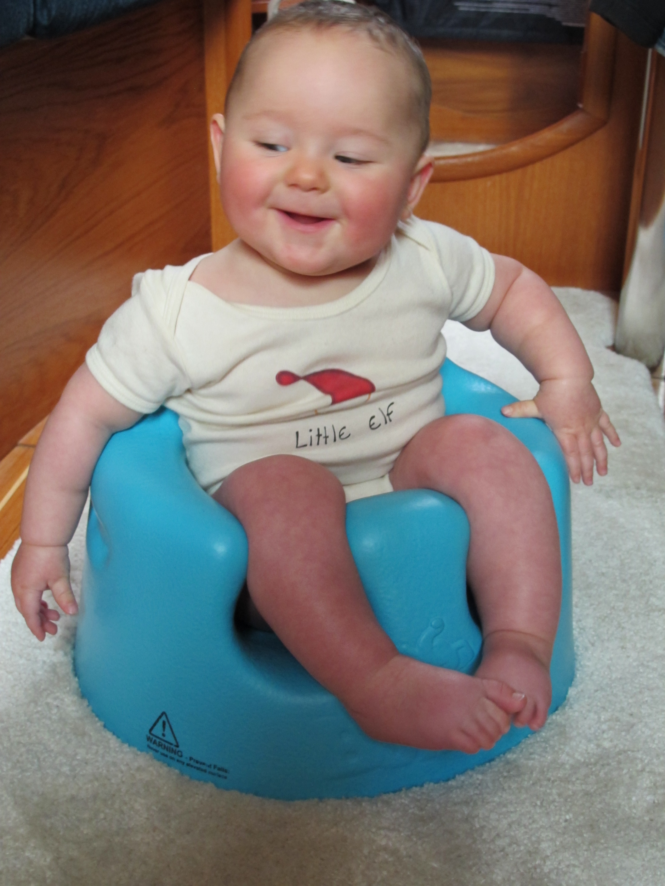 I wish we were together for Christmas, but I know you’re coming to visit me in March, which is just around the corner. I’ve changed so much since October when you last saw me. I can tap dance, and I do a special wave like Princess Diana did. But mine’s better because I wave my hand with my thumb still in my mouth. I always have something in my mouth… I suck on anyone’s thumb, not just mine. The bigger the better, really, so I prefer mom’s and grandpa’s thumbs. I even enjoy sucking on my own big toe. And when grandpa sits on the couch above me while I’m on the floor, I attack his sock, and tongue it like a lizard. I’m still not crawling, but I’m fine-tuning my sitting skills. I wobble occassionally, but I can correct myself in any direction except when I fall backwards (and then I go Bonk!).