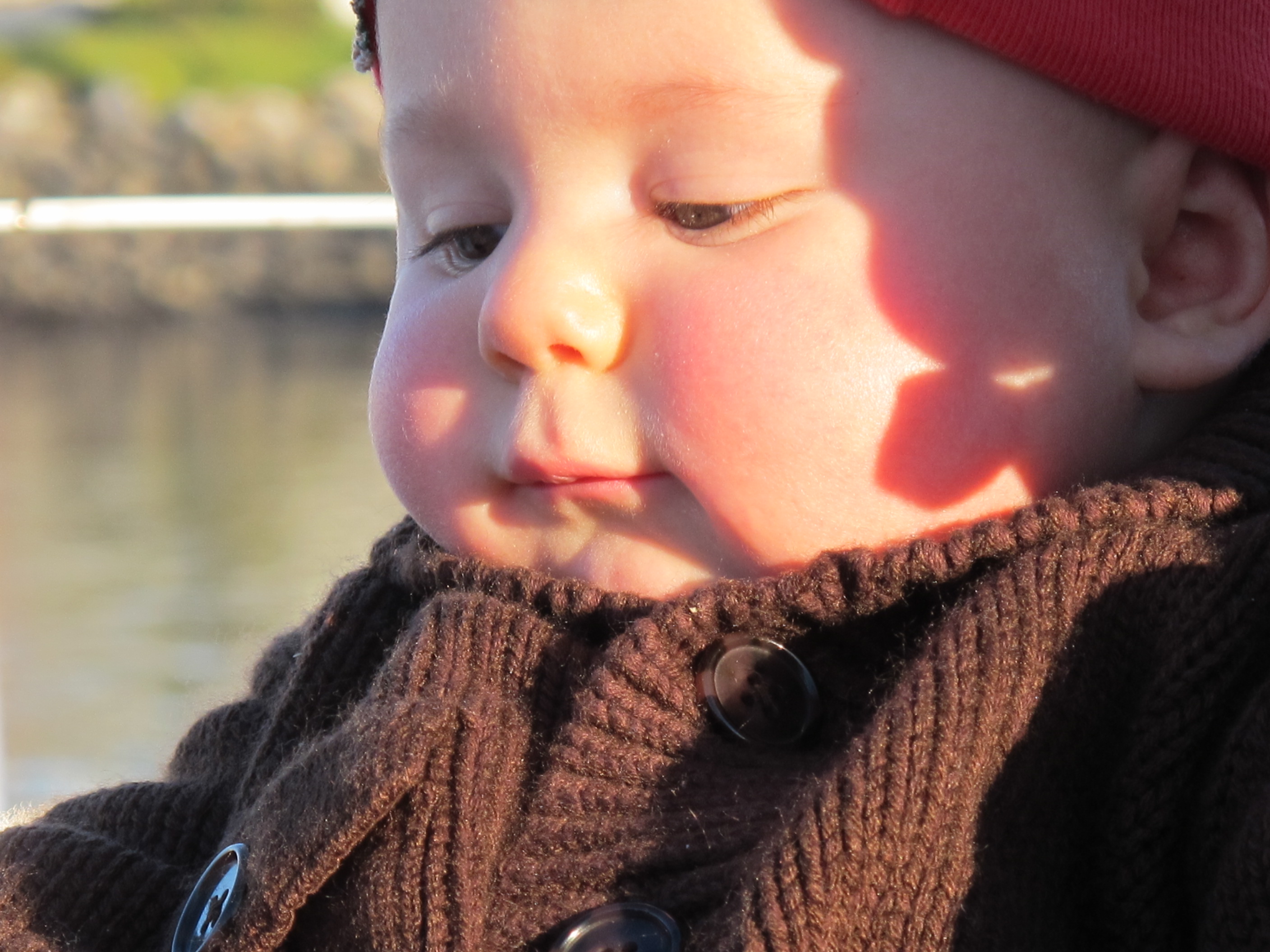 I love all the buttons on the crawl ball… that toy has really captured my interest! I am wearing the cozy fleece vest and pants often b/c they’re ideal for running up and down the docks (kidding, I’m not running quite yet). All the clothes fit perfectly (good timing, as I was running out). Daddy put the train set up on the ledge above my changing table, out-of-reach but within my range of vision when it’s changing time, or when I’m sitting in my own chair. Mommy’s been eating the shortbread, which she says is still her favorite after all these years. Daddy calls my brown sweater an old man’s smoking jacket, but he loves it.