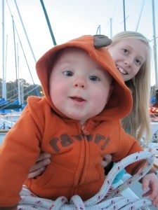 Dad’s home renovation is really coming along nicely! I have mixed feelings about leaving the boat and moving into a house… I love the big bathtub and can imagine myself splashing around in there. My bedroom is so cozy and I’ll enjoy the hardwood floor and space for crawling. I’ll miss being the monkey in the middle between mommy and daddy, each ready to shake up a bottle in a jiffy. I’ll miss snuggling into mommy to avoid the drops of condensation from the hatch, and I’ll miss the bright morning sun beams shining down on me. And I hope we can still go on dinghy rides b/c my life vest finally fits me. Daddy carries me around in it by the neck handle like I’m a kitten. And I’ll miss the ukulele on Saturday mornings, and all the joyful harbor sounds.