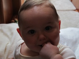 Anyway, I’ll be 9 months this coming weekend! I have my two bottom front teeth now, each one pearly white and straight. They’re strong like a bunny’s, and Daddy gives me lots of carrots to chew on. They’re also great for chewing on toes, mine or anyone’s.