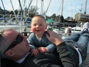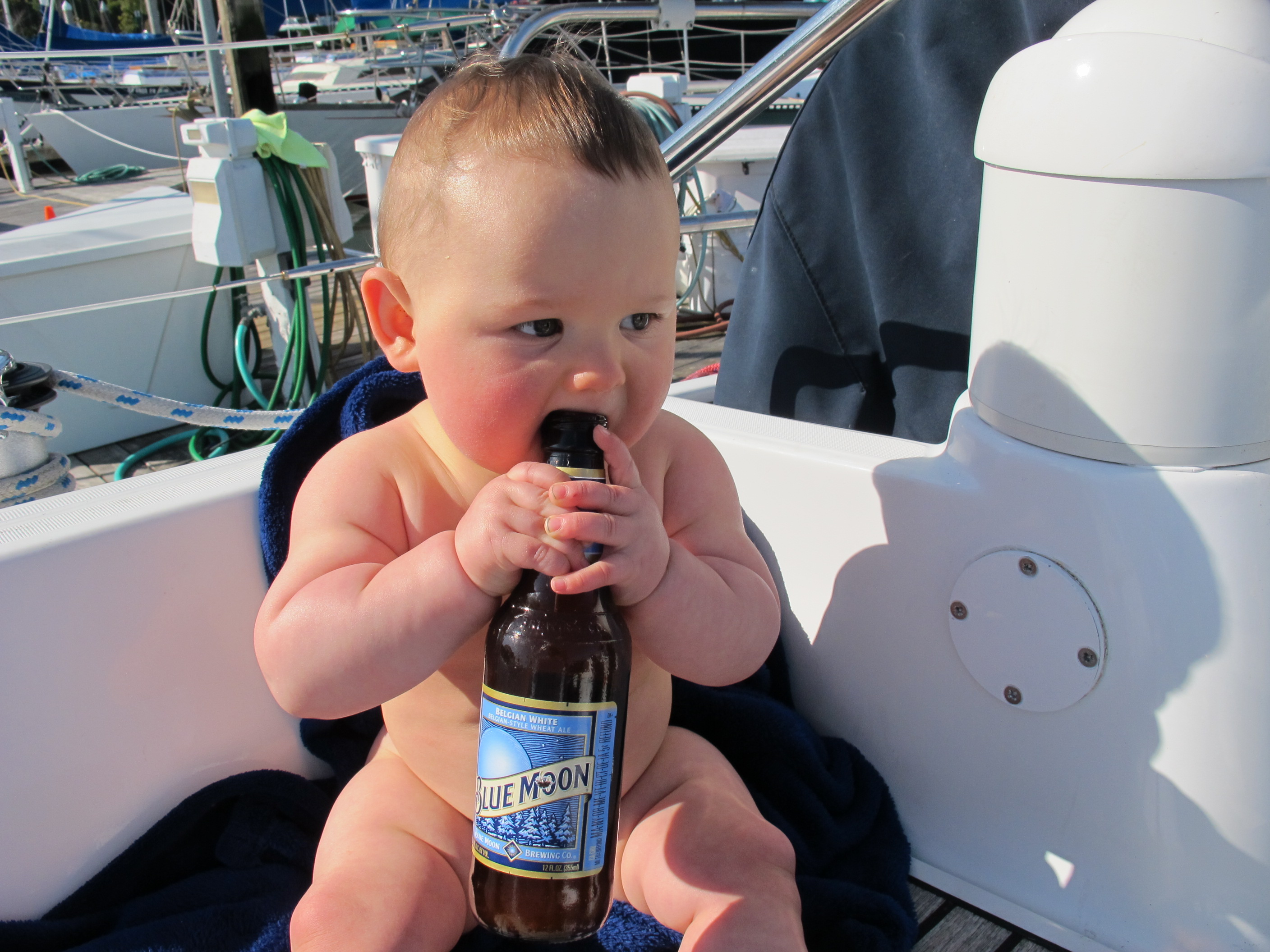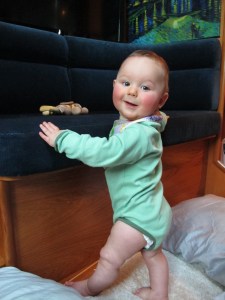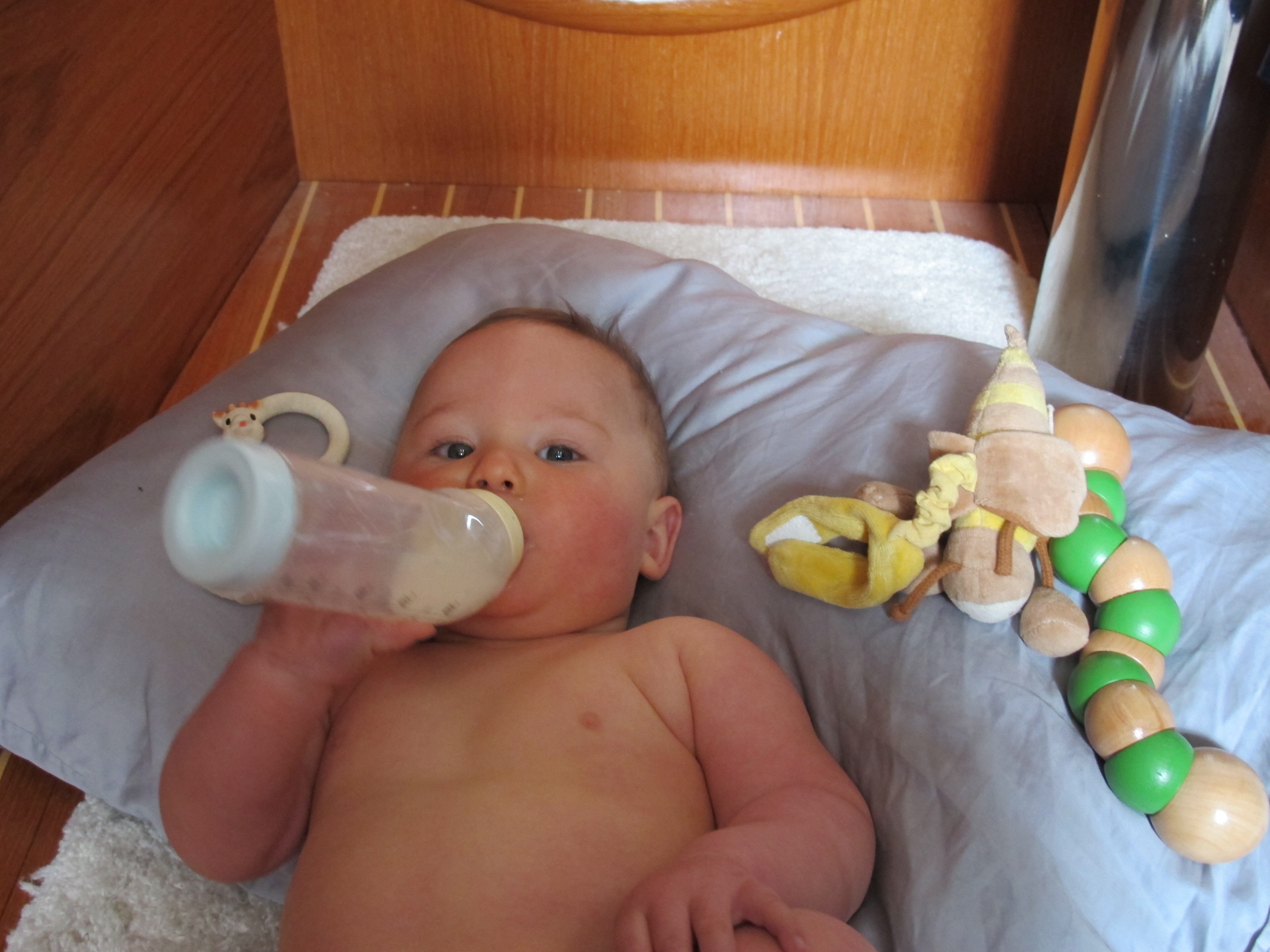 I’m getting pretty adventurous with the solid food, and my favorite meal is spaghetti with cheese. But when the three of us are steaming away in our hotbox of a cabin in the middle of the night, with our own sweat dripping down as condensation from the hatch, there’s still nothing quite as refreshing as a tall, cool glass of milk. I demand it usually twice each night, screaming at 1am and again at 4am. Daddy wakes so startled and disoriented he often bonks his head or spills the milk all over the sheets. During the day, I hold the bottle by myself: