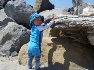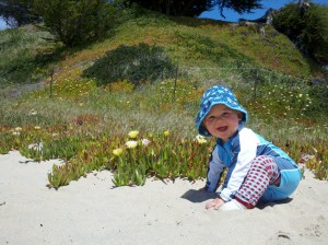 There’s a lot of wave action here, so mommy lets me crawl toward the water, and then she snatches me up at the last instant, letting me splash my feet in the surge. I love to watch the pelicans and surfers, and play with the other kids on the beach (although one mean boy kicked sand in my face!).