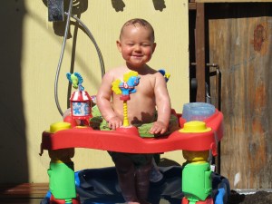 And then I shower outside, naked in the sunshine, standing in my ExerSaucer:
