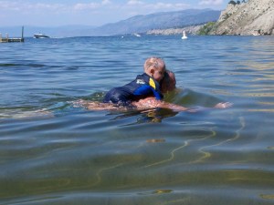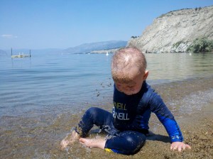 I visited Grandma and Grandpa in Summerland, and went to Okanagan Lake every day with mom, dad, Uncle Terry, Auntie Alice, Tamiyana, and Alexa. Daddy swam like an alligator, with me on his back. And after mom lubed me up with sunscreen, I did a face plant into the sand.