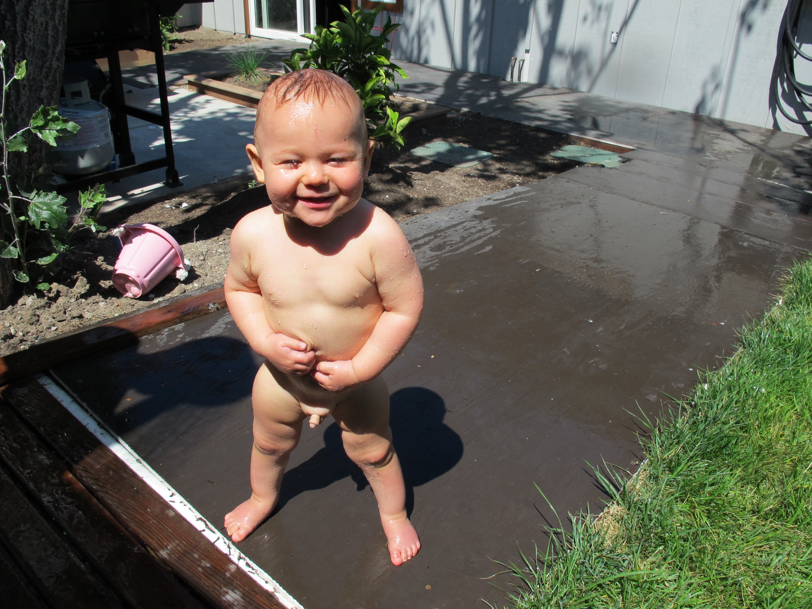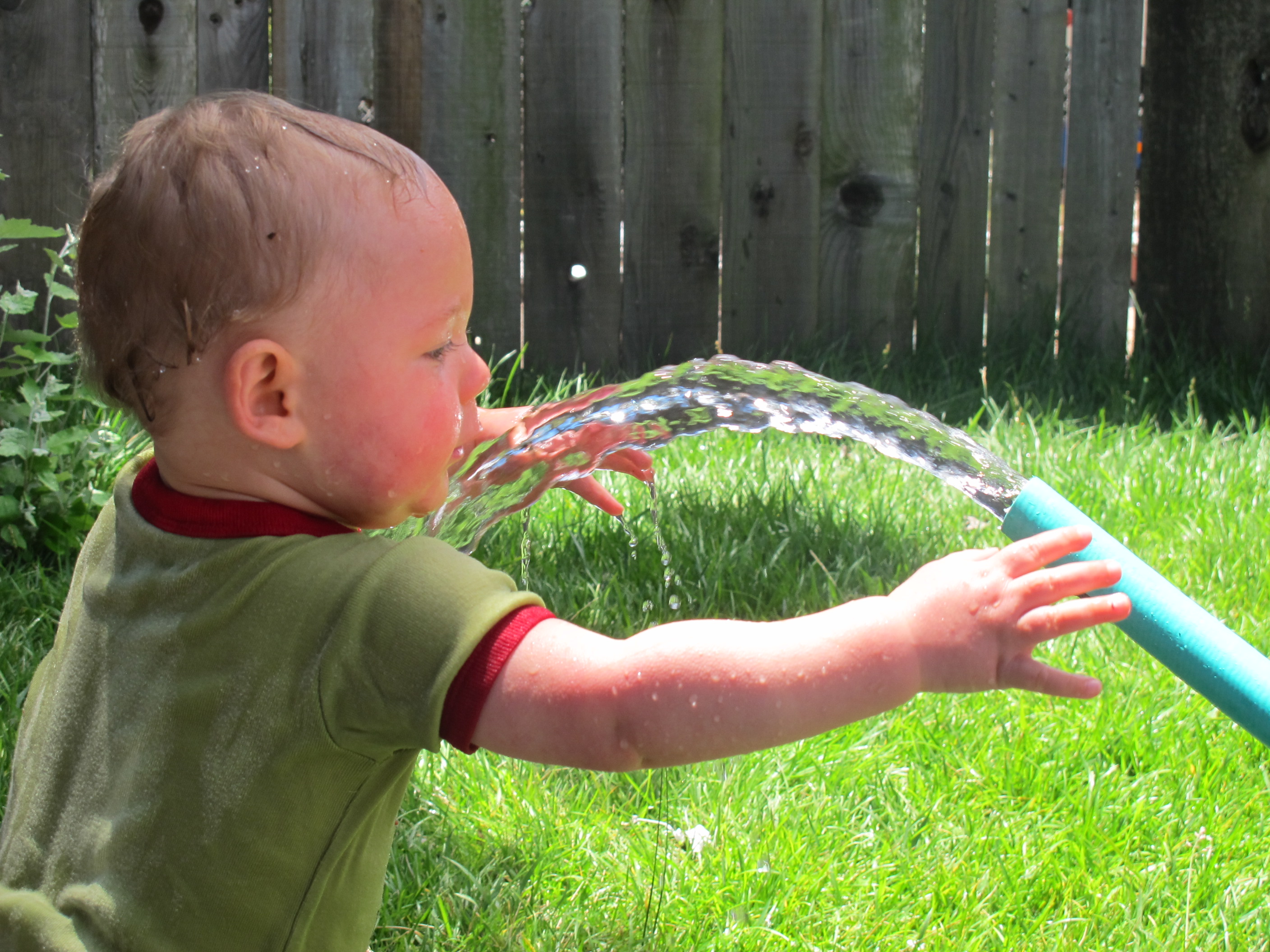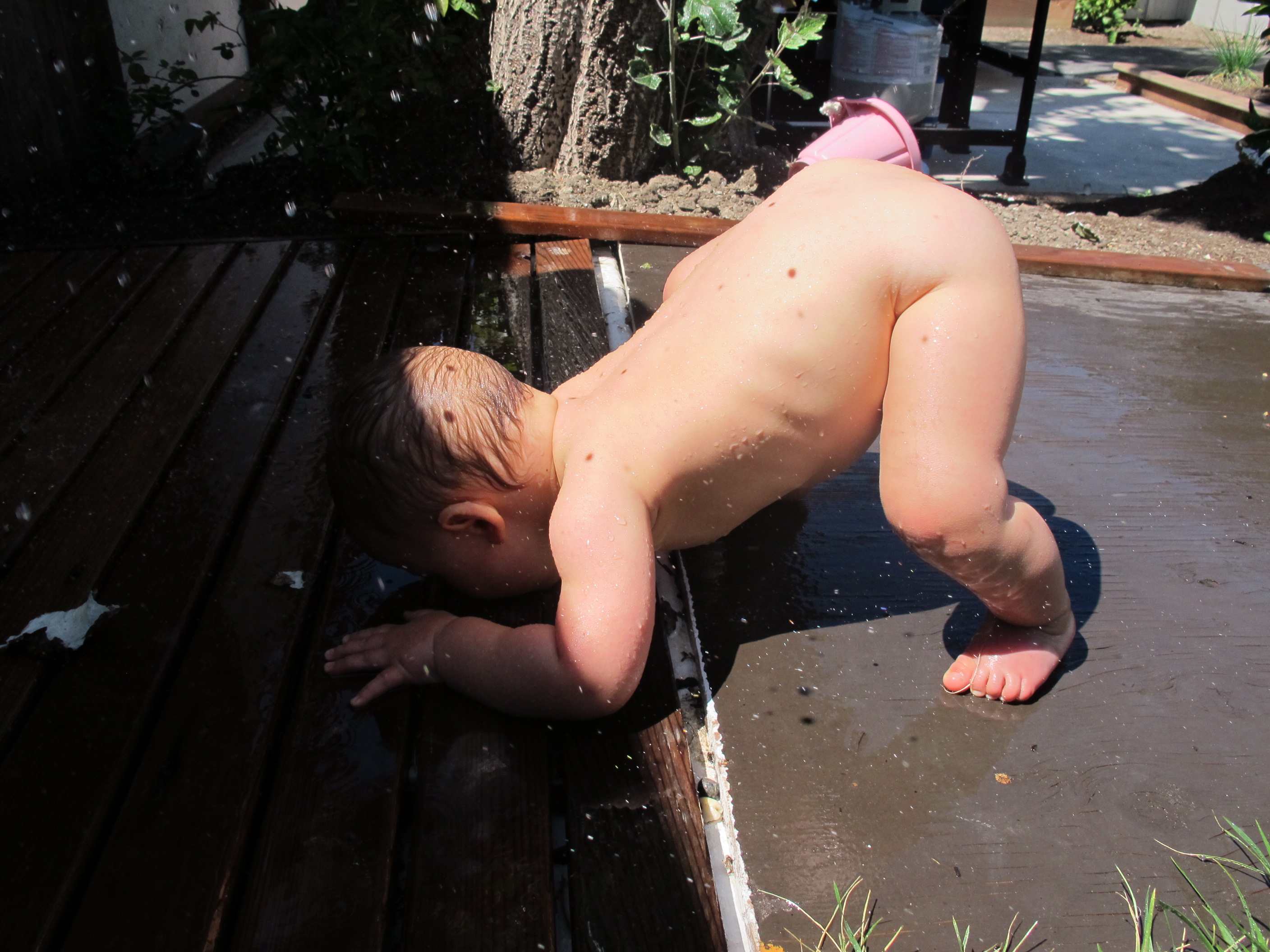 I love water: splashing in the pool, swimming in the lake, showering outside, or drinking from the hose and puddles.