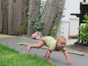 I’m quite athletic, resulting in lots of scrapes and bruises. I fell under the doctor’s table just before my shots. In Bellingham, I fell out of the trailer when banging on the screen door, and (to mom’s horror) tumbled down two stairs. I speedcrawl, or walk with my hands poised to brace the fall and my shoulders hunched up around my ears.
