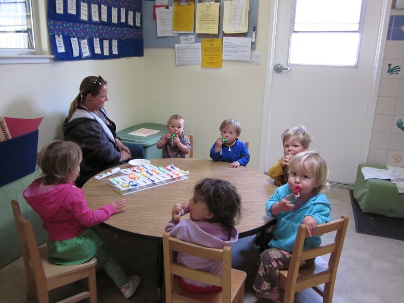 Exploring at Day Care is especially fun, now that I spend 2 days/week with so many friends. When I’m sad at drop off time, the kids come running to comfort me, petting my head and rubbing my back. I know Daddy peeks through a hole in the fence and watches me play. I’m no longer the baby there… there are kids younger than me. Here I am learning to brush my teeth.