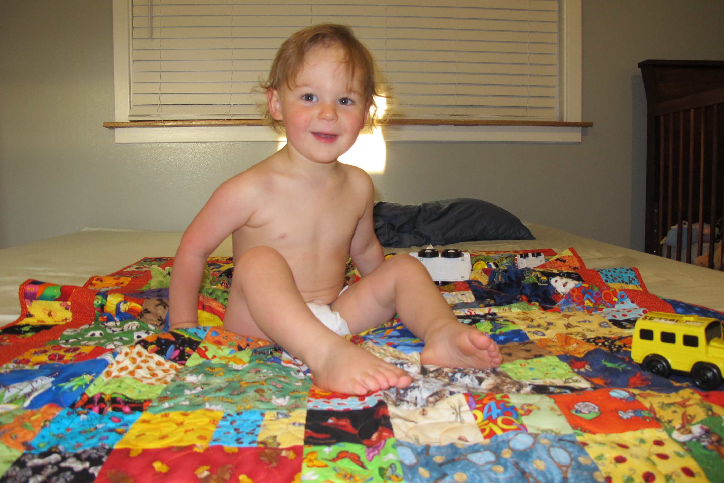 I’m starting to sleep in my big boy bed, face-down and curled up like a peanut. I sleep with Sophie tucked under my arm and a dozen cars under my pillow. I feel snug under the beautiful quilt Auntie Gail made for me.