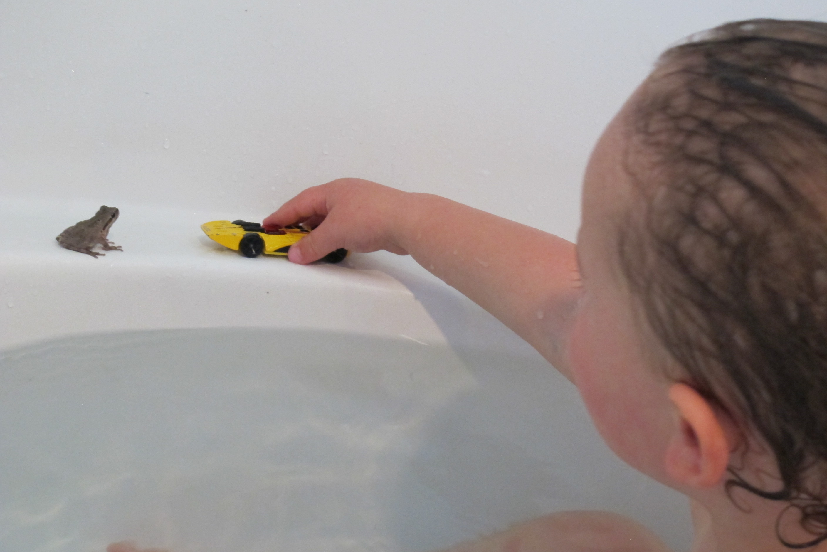 In the evenings, Mommy lets me take toys into the bathtub. I get really excited when the water’s running, racing between the bathroom and my bedroom, grabbing all my Hot Wheels and tossing them into the water. Sometimes I bathe with my farm animals or my airplanes. One time Daddy surprised us with a frog he found in the yard!