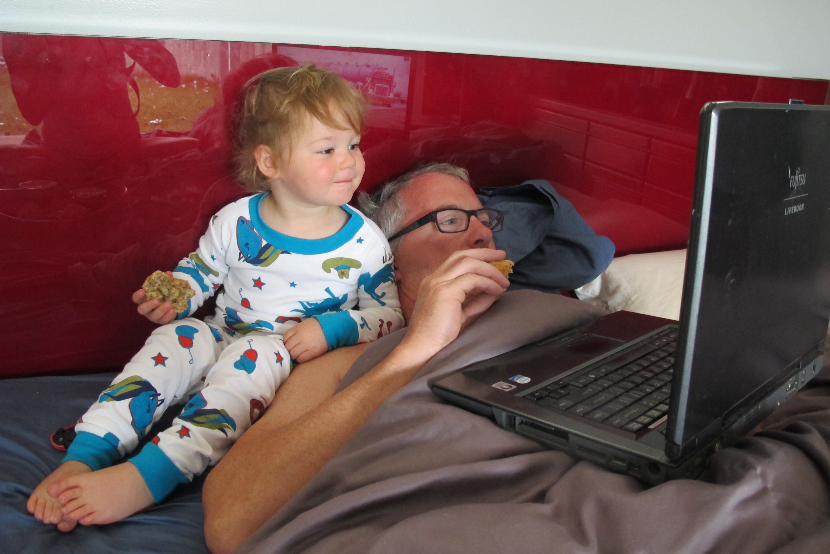 On Saturday mornings, I pull mommy out of bed and say, “Wanna watch cartoons!” Mommy bakes muffins while I laugh at Curious George and mimick his monkey talk. Then I sit on the kitchen counter and push the buttons on the espresso machine to make coffee for Daddy. Then we all get back into bed with Daddy and have breakfast while watching monster truck videos.