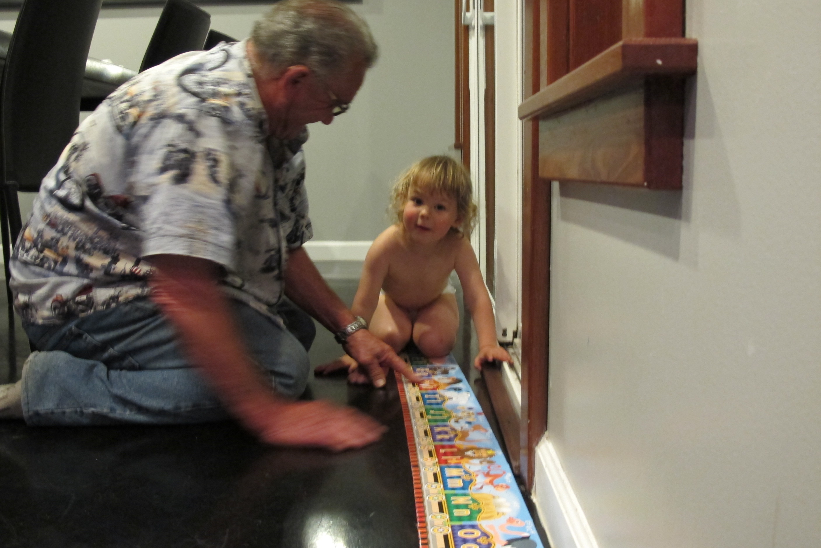 Grandpa is really energetic too… we hunt for alligators and ride horsie. When my horse breaks into a sweat, I let him sleep a little. Boy he snores!