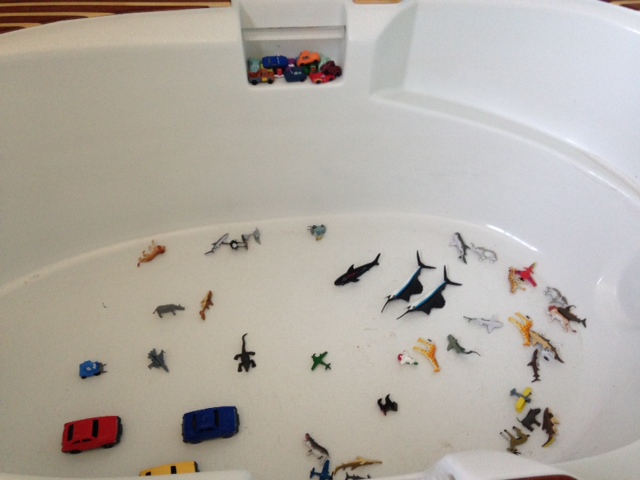 My bathtub is full of sharks and fish to show mommy what I learn at school: