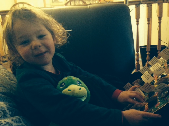 hyattI loved the countdown to Christmas at Grandma’s and Maggie’s house. We went to MCC and bought dozens of cars. We visited Santa, and both sat on his lap. Grandma bought me a Hot Wheels ramp and shark slippers, and let me open a door on my advent calendar.
