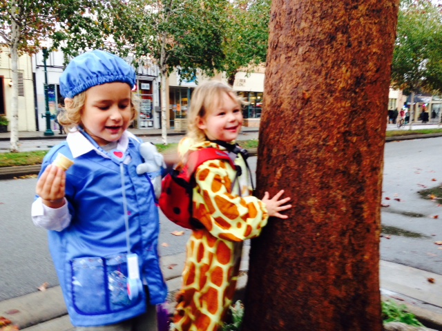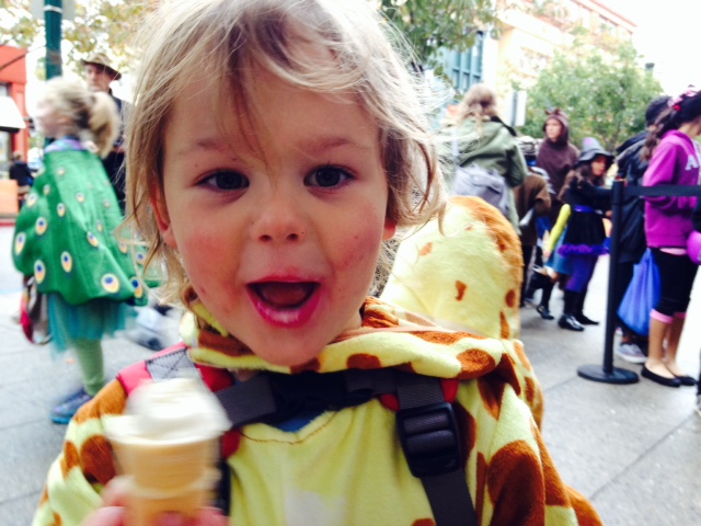 tom_tenI dressed up twice for Halloween! In the daytime, I was a giraffe and Mommy took me downtown Santa Cruz to trick-or-treat. It was an easy score because all the business people loaded goodies into my backpack. I bumped into Dashan and we got ice cream together.